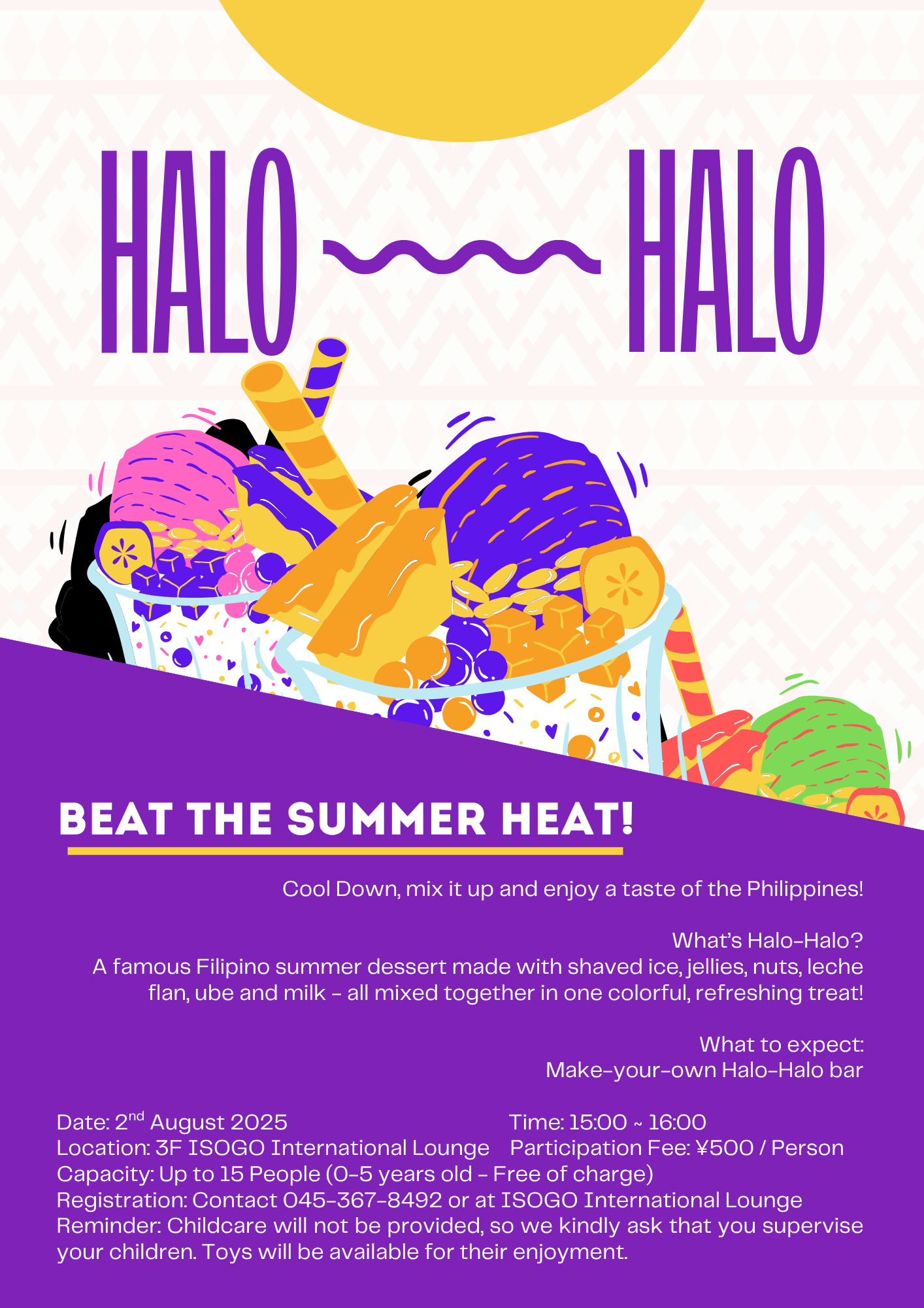 第1弾として、2025年8月2日(土)の午後、「Filipino Club」主催のハロハロパーティーが開催されました。フィリピーノ・クラブ会員家族と、さまざまな国のお友だち総勢19人が集まり、フィリピンの国民的デザート「ハロハロ」を楽しみました。