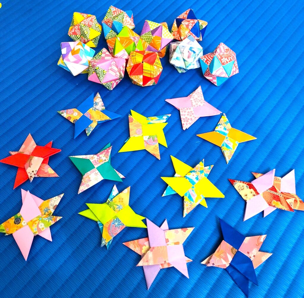 今回、私たちは、けん玉、折り紙、紙ふうせん、だるまおとし、でんでん太鼓、パタパタ、吹き戻し笛、あやとりなど、どれも昔から親しまれてきた日本の伝統的なおもちゃを用意しました。