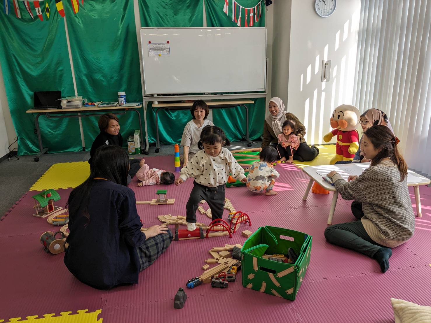2月20日に、今年2回目のプレイグループがありました。今回は、大きなぬいぐるみを置いて、皆さんをお出迎えしました。すぐさまぬいぐるみに駆け寄るお子さんたち、お子さんのお気に入りキャラクターやそのキャラクターがいる遊び場の話で盛り上がるお母さんたち、共通の話題は、皆さんを繋げてくれるきっかけになりました。