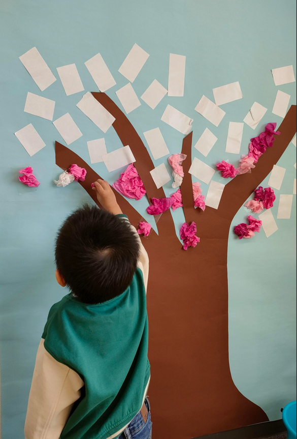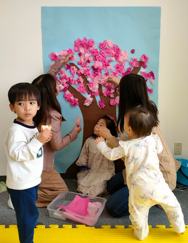 ピンクのお花紙をクシュクシュッと丸めて、枯れ木に張り付けていきます。子どもたちが小さな手で、お花紙をいっしょうけんめい丸める姿がとてもかわいかったです。ママたちもおしゃべりに花を咲かせながら、楽しく制作してくれました。