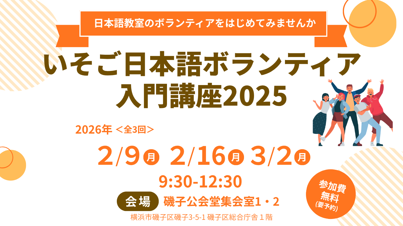 磯子区の多文化共生や外国の方とのコミュニケーションについて理解を深め、日本語学習支援や日本語ボランティアについての基礎を学べる講座です。区内日本語教室の見学もできます。