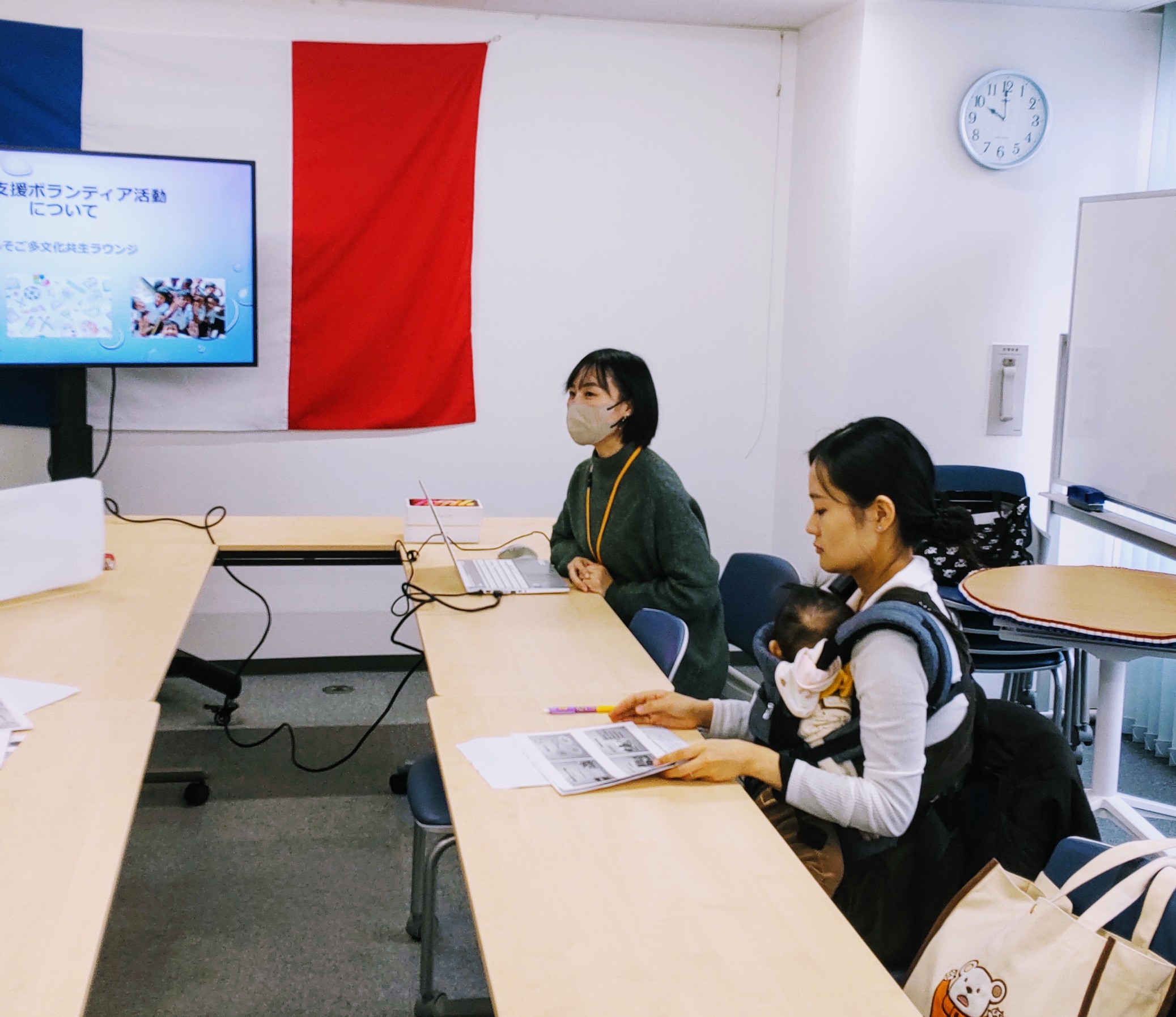 まずは、いそご多文化共生ラウンジの取り組みを説明し、語学ボランティアの活動内容を経験者でもあるスタッフから紹介させていただきました。