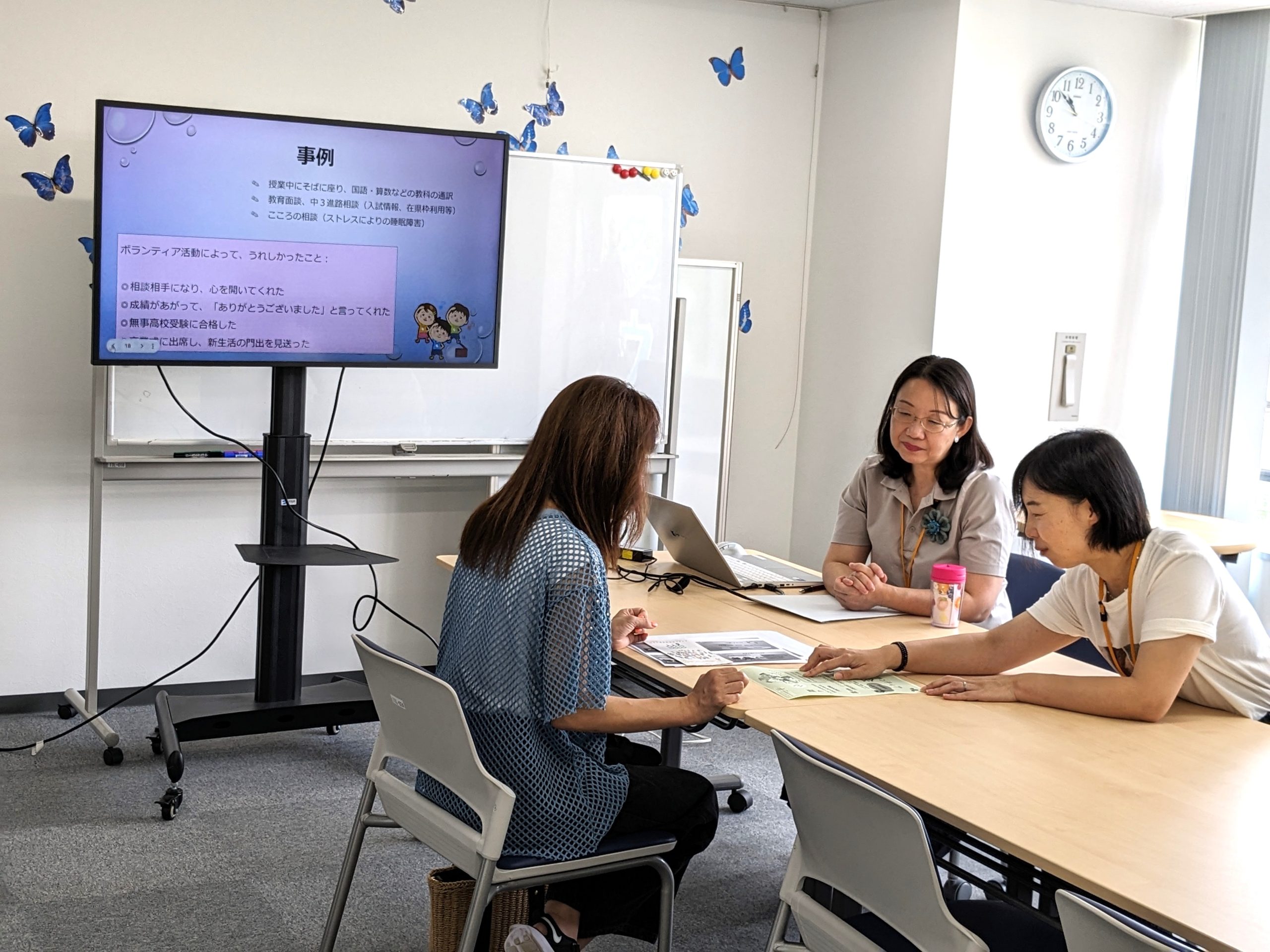説明会では、主に母語支援ボランティア事業の内容をスライドで紹介しながら、実際にどのようにして子どもたちを支援するのかをご説明しました。説明を聞き、疑問に思うこと・心配に思うことなども、ざっくばらんにお話しできる場です。どうぞお気軽にお尋ねください!