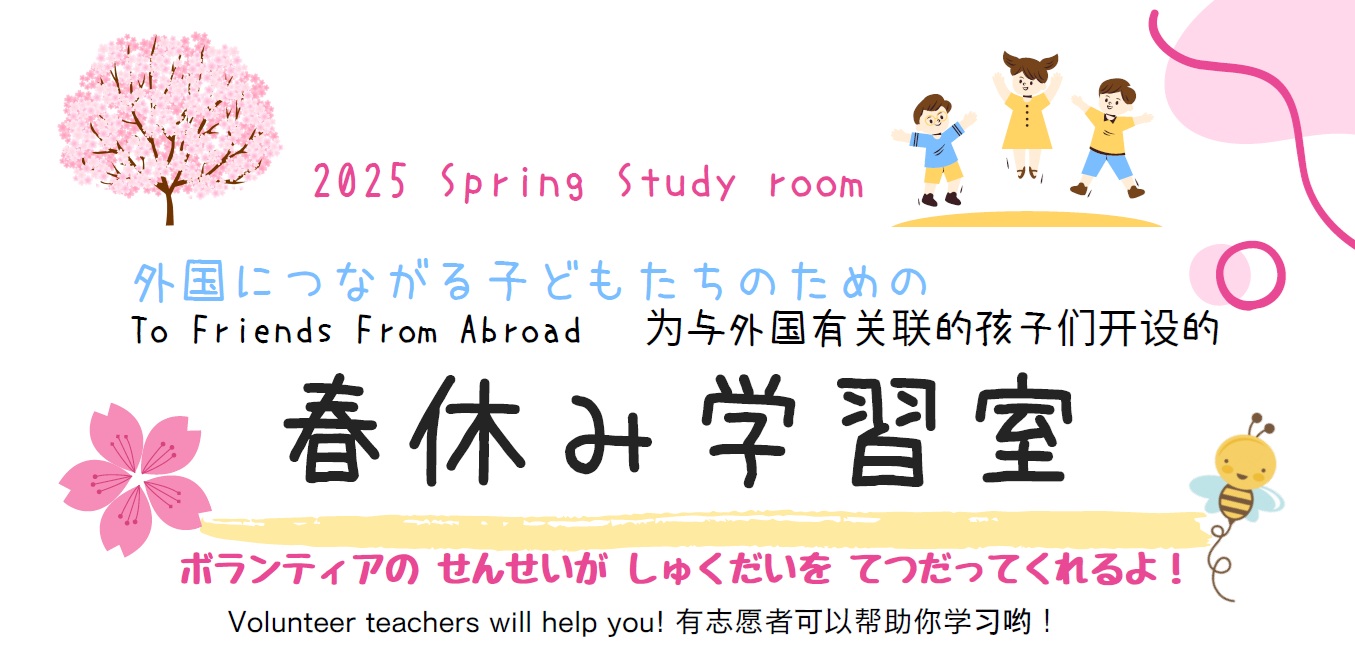 【募集終了】春休み学習室 3/26-29、31、4/1-5 開催 ~ボランティアの せんせいが しゅくだいを てつだってくれるよ!/ Volunteer teachers will help you!/ 有志愿者可以帮助你学习哟!~